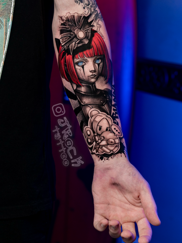 My name is Julia Rock, also known as JRockTattoo. I’ve been tattooing for over seven years, driven by my love for rock music, motorcycles, and geek culture. My style is a modern evolution of Trash Polka — bold black-and-red contrasts combined with geometric precision and layered symbolism. I draw strong inspiration from comics, anime, and video games, weaving their visual energy, dynamic storytelling, and character aesthetics into every design. Each tattoo I create is a visual story with a nerdy, rock’n’roll spirit.