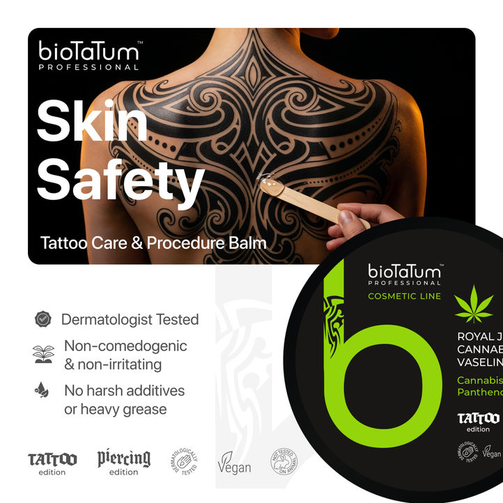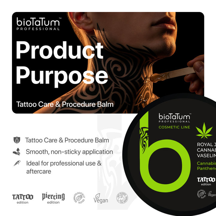 Dövme uygulamaları sırasında kullanılmak üzere özel olarak formüle edilmiş profesyonel bir vazelin. Shea yağı (Butyrospermum Parkii Butter), kenevir tohumu yağı (Cannabis Sativa Seed Oil) ve pantenol içerir; cildi besler, tahrişi yatıştırır ve kuruluğu önlemeye yardımcı olur.